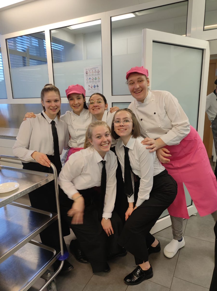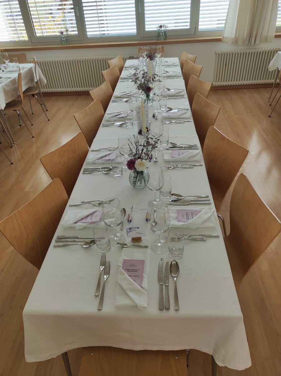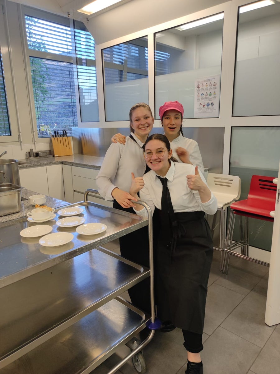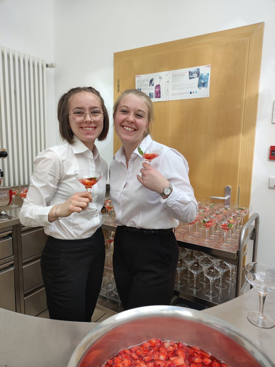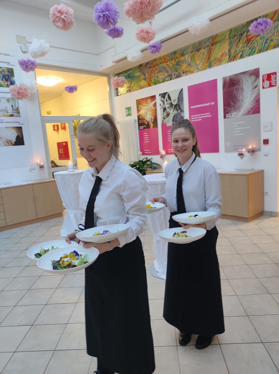Kürzlich setzten sich die Schülerinnen der 4. Klasse der Fachschule für Hauswirtschaft und Ernährung Kortsch in den Fächern Eventmanagement, Gemeinschaftsverpflegung und Raumgestaltung mit der Durchführung eines Gala-Dinners im Sinne der Nachhaltigkeit auseinander. So wurde beispielsweise darauf geachtet, dass regionale und saisonale Produkte in der Küche verarbeitet wurden und auch bei der Herstellung der Dekoration und dem Tischschmuck griffen die Schülerinnen auf umweltfreundliche Materialien zurück. Tatkräftig unterstützt wurden sie bei der Organisation des Events von den Fachlehrerinnen Gufler Christine, Fischer Laura, Telser Sinja, vom Hauspersonal der Fachschule und vom Koch Tschenett Martin. Von der Zielsetzung und Planung, über die Vorbereitung, Kostenkalkulation, Auswahl und Zubereitung der Speisen sowie den Service, konnten die Schüler/-innen ihr zuvor theoretisch erworbenes Wissen in die Praxis umsetzen. Das Motto „Wir blühen auf“ spiegelte sich in den Einladungen, in der Dekoration und im Menü wider und die gesamte Veranstaltung bildete somit ein harmonisches Gefüge. Schließlich konnten sich die geladenen Gäste, bestehend aus der Direktion, Lehrpersonen, Eltern, Geschwister und Verwandte von der Kreativität, dem Fleiß, der Teamfähigkeit und dem Können der Schülerinnen überzeugen. Der Abend begann mit einem Aperitif in der Schulhalle. Anschließend wurden die Gäste von den angehenden Absolventinnen der 4. Klasse in den Speisesaal geführt, wo der erste Gang, nämlich eine feine Spargelcremesuppe mit knuspriger Blätterteigstange serviert wurde. Auch eine entsprechende Weinempfehlung gaben die Gastgeberinnen ab. Als Vorspeise wurden Ravioli mit Bärlauch-Feta-Füllung, garniert mit essbaren Blüten, aufgetischt. Dem folgte als Hauptspeise ein zarter Kalbsbraten an Frühlingsgemüse und Beilagen. Den krönenden Abschluss bildete die Joghurtterrine auf Fruchtspiegel. Zum Abschluss stießen die Gäste noch mit einem passenden Digestif auf einen gelungenen Abend an.